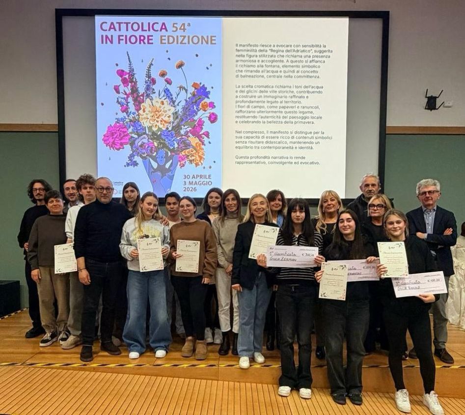 Una sirena che sorregge un bouquet esplosivo di fiori e colori. Svelato il manifesto della 54° edizione di “Cattolica in fiore”, la storica mostra-mercato dedicata ai florovivaisti in programma dal 30 aprile al 3 maggio 2026. Anche quest’anno, come da tradizione, l’Amministrazione comunale ha voluto affidare la creazione della grafica del manifesto ai giovani talenti del Liceo Volta-Fellini (indirizzo artistico) tramite il concorso di idee che ha visto la partecipazione di una quarantina di studenti e studentesse. Dopo una prima selezione e valutazione dei lavori finalisti, tutti di altissimo livello, avvenuta una settimana fa, mercoledì mattina, la sindaca Franca Foronchi, insieme con l’assessora al Turismo Elisabetta Bartolucci e la dirigente al turismo Claudia Rufer, sono ritornate al Liceo Volta-Fellini per decretare l’opera vincitrice e assegnare i vari riconoscimenti nel corso della cerimonia di premiazione. Autrice della grafica vincitrice è Giulia Zermian (4C). Questa la motivazione della scelta: “la proposta selezionata si distingue per la sua eleganza compositiva e per la capacità di racchiudere, in un’unica immagine, molteplici livelli di significato coerenti con l’identità di Cattolica e con il tema dell’evento. Il manifesto riesce a evocare con sensibilità la femminilità della “Regina dell’Adriatico”, suggerita nella figura stilizzata che richiama una presenza armoniosa e accogliente. A questo si affianca il richiamo alla fontana, elemento simbolico che rimanda all’acqua e quindi al concetto di balneazione, centrale nella committenza. La scelta cromatica, delicata ma al tempo stesso vivace, richiama i toni dell’acqua e dei glicini delle ville storiche, contribuendo a costruire un immaginario raffinato e profondamente legato al territorio. I fiori di campo, come papaveri e ranuncoli, rafforzano ulteriormente questo legame, restituendo l’autenticità del paesaggio locale e celebrando la bellezza della primavera. Il manifesto si distingue per la sua capacità di essere ricco di contenuti simbolici senza risultare didascalico, mantenendo un equilibrio tra contemporaneità e identità. Questa profondità narrativa lo rende rappresentativo, coinvolgente ed evocativo”.