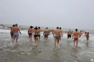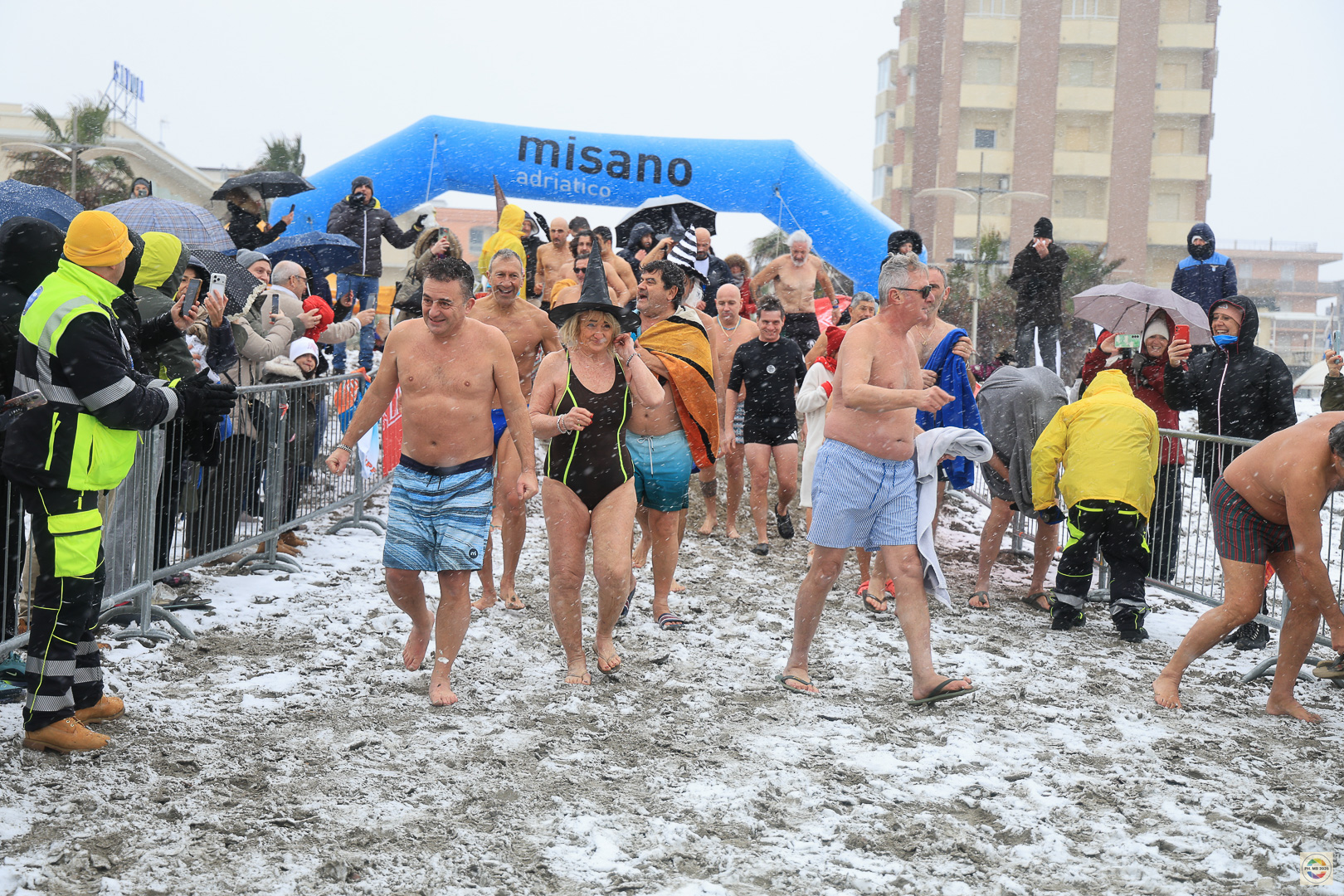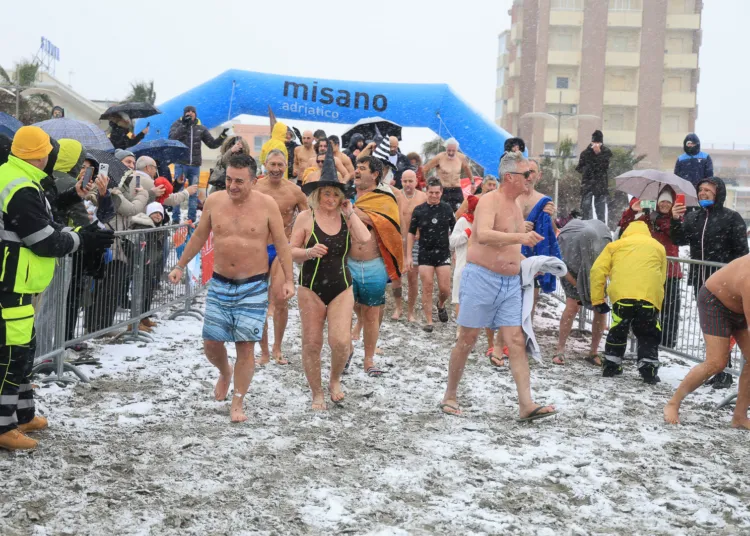 Neve e vento invece hanno messo a dura prova  gli organizzatori dell’ormai tradizionale Tuffo Della Befana a Misano Adriatico che si è svolto regolarmente il sei gennaio in piazza Roma. Dopo qualche perplessità, gli amici del bagno 61, Max e Luca (il tecnico del Comune) di primo mattino sotto una nevicata d’alta quota si sono ritrovati in spiaggia per allestire con archi, striscioni, tende per gli spogliatoi e un ricco buffet nella speranza di vedere ripagato il lavoro dal pubblico e dai temerari decisi a tuffarsi in mare con condizioni proibitive. Quasi increduli, alle 11 esatte 30 persone con il sindaco Fabrizio Piccioni in testa, e una nutrita partecipazione femminile, si sono tuffati in acqua con una temperatura che si aggirava tra i 6/7 gradi.