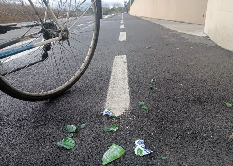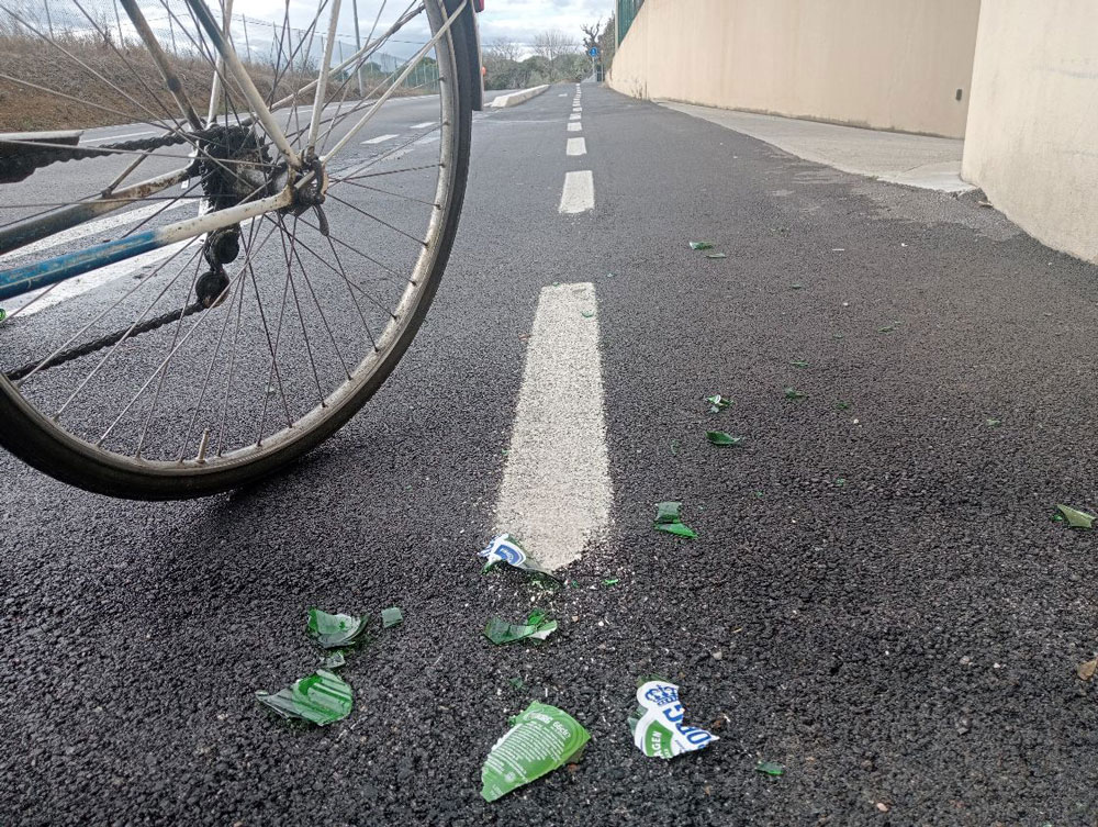Pericolo per le persone e le biciclette. Lungo la ciclabile anche bottiglie di birra in abbandono. Quando si raggiunge la prima rotonda (quella con il povero ulivo) e si gira a destra, non appena la strada spiana, a destra, per centinaia di metri si contano bottiglie vuote di birra ed immondizia.
