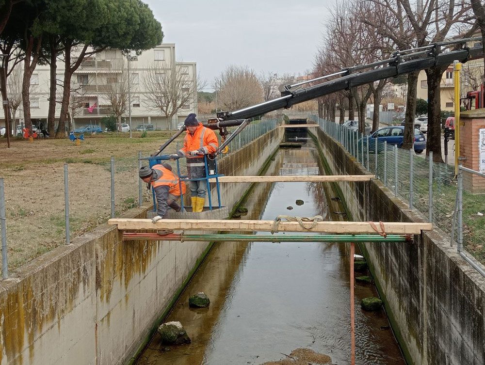 Oggi degli operai hanno posizionato delle travi di abete tra le due spalle-argine in cemento armato del Rio Agina a mare di piazza Gramsci. Le due sponde, cause le piogge torrenziali, stanno cedendo (una si è abbattuta nel letto del fiumiciattolo la scorsa estate). Da un punto di vista estatico la visione è piacevole; il legno fa sempre un bell’effetto. Un intervento forte richiederebbe uno sforzo economico importante per il Comune di Misano.