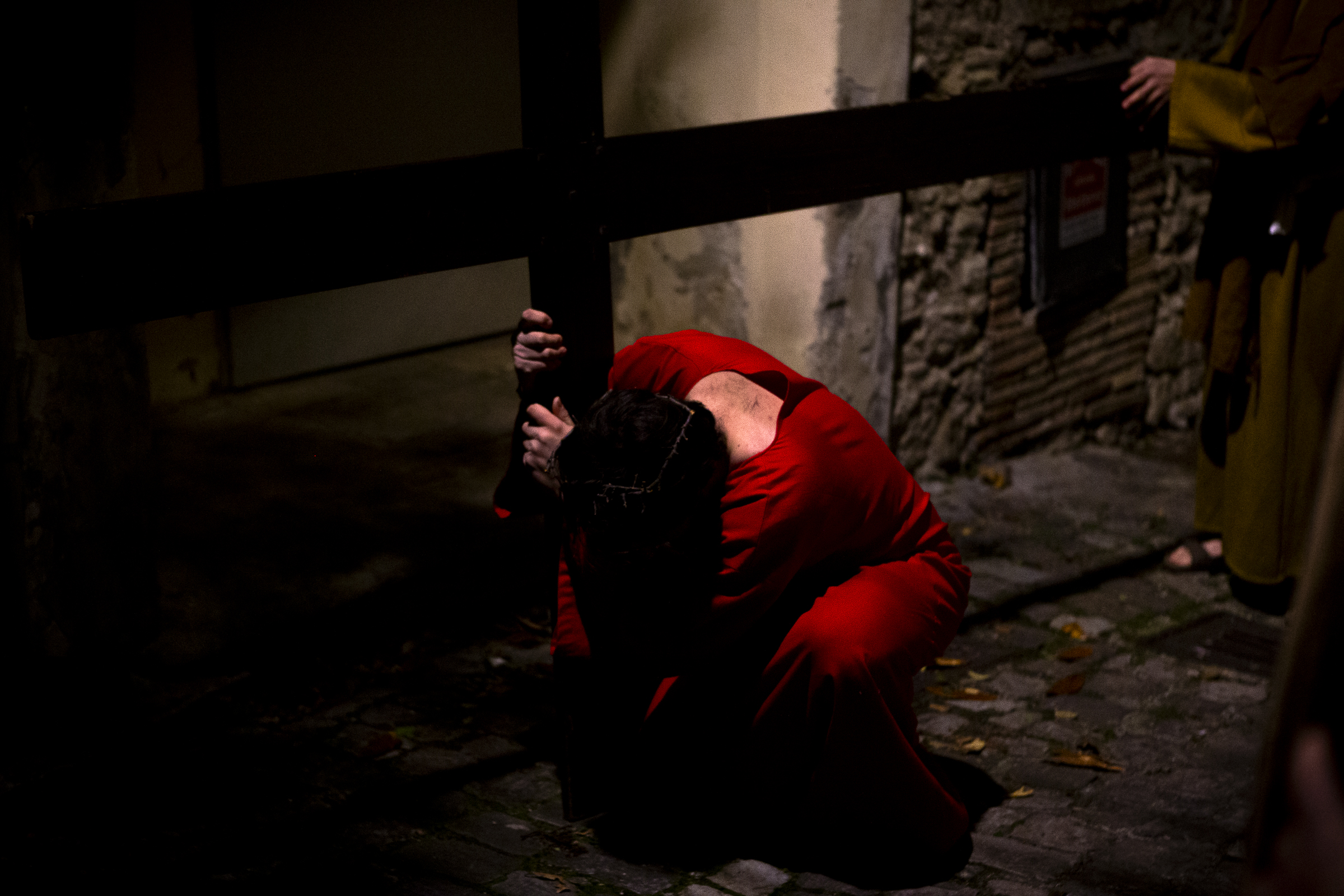 Il corteo, dopo aver fatto un lungo e suggestivo percorso attraverso il centro storico e la piazza, arriva al monastero delle Monache Agostiniane di Sant’Antonio da Padova e sosta brevemente dentro la piccola chiesa. Le alture della Rupe, ai piedi dell’antico monastero agostiniano, richiamano il Golgota, in un contesto naturale fortemente solenne e suggestivo, illuminato solo da torce e falò. Qui viene rappresentata la Rievocazione della Passione e Morte di Gesù a cura della Filodrammatica Pennese.
