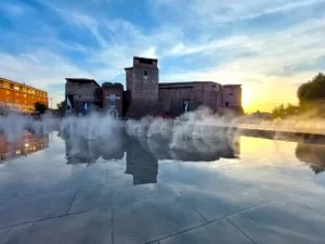 > Piazza dei Sogni (Piazza Malatesta), spazio evocativo che trasforma l’area urbana in un racconto simbolico felliniano, con elementi scenografici, un velo d’acqua e una panca circolare che evocano il senso del sogno cinematografico